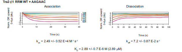 通過該技術,研究人員成功地研究了三種不同的蛋白質與RNA的結合,并得到了與其他常用方法(如SPR或ITC)相近的結果,三種不同親和力的蛋白質與RNA的相互作用:Fox-1 RRM(親和力為1.09 μM)、SRSF1 RRM2(親和力為0.8 μM)和Tra2- β1 RRM(親和力為2.25 μM)。通過switchSENSE技術,可以測量蛋白質與RNA結合和解離的動力學參數。通過測量DNA-RNA雙鏈的切換速度,可以獲得可重復的KD值。這兩種方法在研究不同類型的相互作用時是互補的。switchSENSE®方法,可以測量非常低的KD值,例如Fox-1 RRM的KD值為1.49 nM。此外,與其他使用熒光檢測蛋白質-RNA相互作用的方法相比,switchSENSE®方法不需要對生物分子進行標記,并且需要的材料量更少,成本更低。