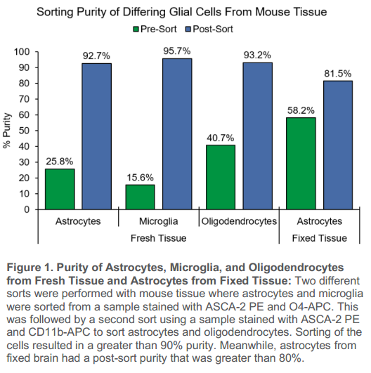 在大腦這一復雜的器官中,神經膠質細胞扮演著至關重要的角色。包括星形膠質細胞、少突膠質細胞和小膠質細胞在內的神經膠質細胞,這些細胞不僅參與調節大腦的穩態功能、髓鞘形成及神經信號傳遞,還在神經損傷的響應中發揮了重要作用[1]。這些細胞功能的任何失調,都可能與發育性和神經退行性疾病的發病機制有關[2]。在大腦樣本中,小膠質細胞通常僅占目標群體的10%不到,少突膠質細胞則約占目標群體的20%以上,而星形膠質細胞可占目標群體的17%至61%[3,4]。細胞分選可以幫助這些神經膠質研究,并加強從不同細胞群中純化單個細胞類型,正如在大腦中發現的那樣。
