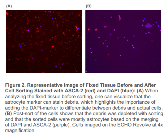 圖2. 用ASCA-2(紅色)和DAPI(藍色)染色細胞分選前后固定組織代表圖:(A)在分選前對固定組織進行分析時,可觀察到星形膠質細胞標記物能夠染色碎片,這突出了添加DPAI-maker區分碎片和實際細胞的重要性。(B)細胞后分選顯示碎片被分選耗盡,根據DAPI和ASCA-2的合并,分選的細胞以星形膠質細胞為主(紫色)。細胞在ECHO Revolve 上以4倍放大率成像。