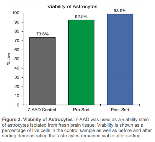 圖3. 星形膠質細胞的活率:7-AAD 被用作從新鮮腦組織中分離出的星形膠質細胞的活性染色劑。活性為對照樣本以及分選前后活細胞的百分比,表明星形膠質細胞在分選后仍具有活性。