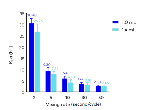 1、混合速率是影響S.NEST中KLa的關鍵因素。在本研究中,我們測試了從2到50秒/周期的五個混合速率,結果表明,KLa隨著混合速率的增加而增加(圖3)。在使用1.0 mL的DPBS時,KLa在2秒/周期的混合速率下達到了最大值30.48 h-1。此外,工作體積也是影響S.NEST中KLa的另一個關鍵因素,增加工作體積對KLa有負面影響。在相同的混合速率下,1.0 mL工作體積的KLa比1.4 mL工作體積的KLa高出約15%。
