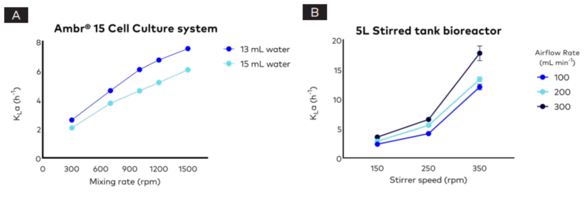 2、基于本研究的KLa,我們分析了KLa與混合速率的相關性(圖4)。KLa與混合速率-1成正比。因此,這些曲線可以作為選擇所需混合速率的指導。如圖5所示,Sartorius Ambr®15細胞培養系統(圖5A)和5L生物反應器(圖5B)在不同條件下的KLa值[5,6]。