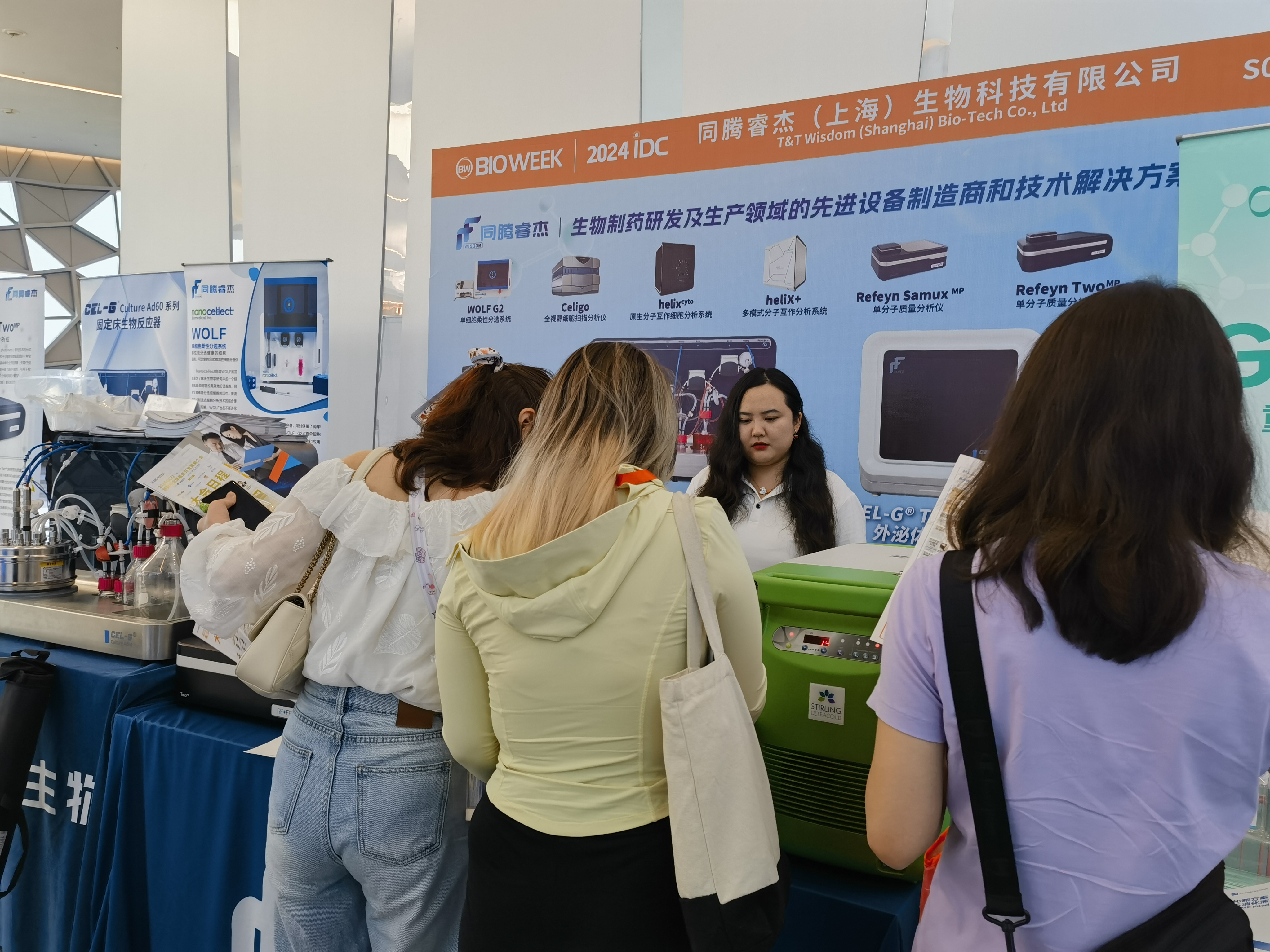 其中,CEL-G®Culture Ad60 系列固定床生物反應器、Refeyn TwoMP 單分子質量分析系統、WOLF G2 單細胞柔性分選系統以及helixcyto 原生分子互作細胞分析系統,憑借其卓越的性能和創新的設計,吸引了眾多專家學者和行業同仁的駐足圍觀與咨詢。