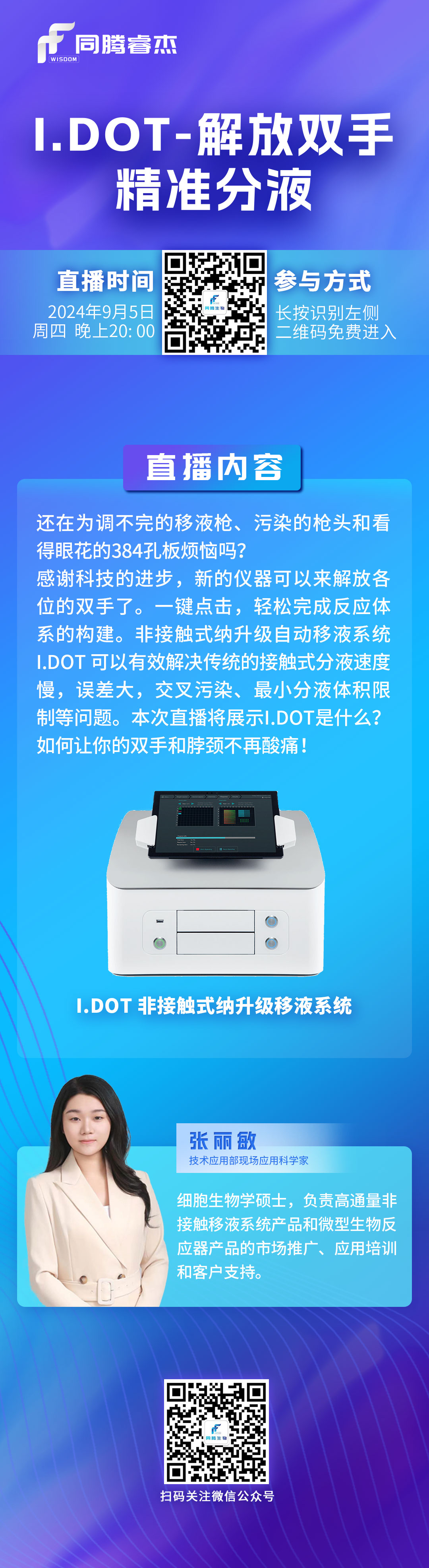 還在為調不完的移液槍、污染的槍頭和看得眼花的384孔板煩惱嗎?感謝科技的進步,新的儀器可以來解放各位的雙手了。一鍵點擊,輕松完成反應體系的構建。非接觸式納升級自動移液系統I.DOT,可有效解決傳統的接觸式分液速度慢,誤差大,交叉污染、最小分液體積限制等問題。本次直播將展示I.DOT是什么?如何讓你的雙手和脖頸不再酸痛!