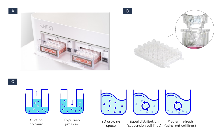 S.NEST微生物反應(yīng)器的開發(fā)目的是通過在較小的范圍內(nèi)提供強(qiáng)大的實(shí)時(shí)監(jiān)控來解決這些挑戰(zhàn)。它有四個(gè)腔室,每個(gè)腔室由加熱模塊、水托盤、濕度和二氧化碳傳感器組成,以獨(dú)立控制每個(gè)腔室的環(huán)境(圖1A)。可利用S.NEST蓋子實(shí)現(xiàn)細(xì)胞的混合培養(yǎng)。專利蓋子上的冷凝設(shè)計(jì)能有效地減少蒸發(fā)(圖1B)。S.NEST蓋子的96或24流體通道可以通過氣動(dòng)混合使培養(yǎng)基更均勻(圖1C)并通過固定在微孔板底部的光學(xué)傳感器點(diǎn)監(jiān)測(cè)DO和pH(圖1D)。