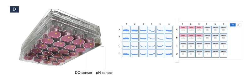 圖1 (A) S.NEST培養(yǎng)系統(tǒng)包含4個(gè)獨(dú)立的腔室。(B)可消耗的S.NEST蓋子,帶有防止蒸發(fā)的冷凝設(shè)計(jì)。(C)S.NEST蓋子混和培養(yǎng)基,使培養(yǎng)體系更加均勻。(D) S.NEST系統(tǒng)實(shí)時(shí)監(jiān)測(cè)DO和pH。傳感器點(diǎn)附著在微孔板底部。