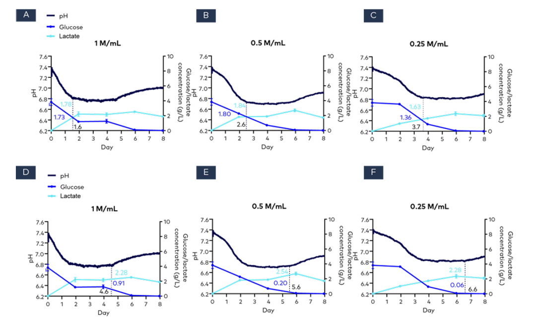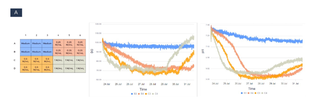 細(xì)胞分別以2.5x105 /mL、5x105 /mL和1x106 /mL的密度接種于24孔板中,并加入培養(yǎng)基作為對(duì)照(圖2A)。連續(xù)監(jiān)測(cè)8 天 DO和pH。我們發(fā)現(xiàn)每個(gè)DO和pH曲線都有兩個(gè)轉(zhuǎn)折點(diǎn)。各組的DO和pH曲線在開始時(shí)均下降(圖2)。各DO和pH組的性能下降與細(xì)胞密度有關(guān)。高接種密度組的DO和pH下降趨勢(shì)大于低接種密度組(圖2A)。在第一個(gè)轉(zhuǎn)折點(diǎn),DO和pH的下降曲線變平緩,可能是由于細(xì)胞生長狀況和細(xì)胞代謝的變化。在培養(yǎng)期后期,觀察到第二個(gè)轉(zhuǎn)折點(diǎn),各組的DO和pH曲線呈上升趨勢(shì),與細(xì)胞接種密度呈正相關(guān)(圖2A)。為了檢驗(yàn)DO和pH曲線是否與細(xì)胞生長曲線相關(guān),測(cè)量細(xì)胞生長和活率。接種密度較高的細(xì)胞總細(xì)胞密度(TCD)和活細(xì)胞密度(VCD)較高,但在培養(yǎng)期結(jié)束時(shí),細(xì)胞活力較低(圖2B)。