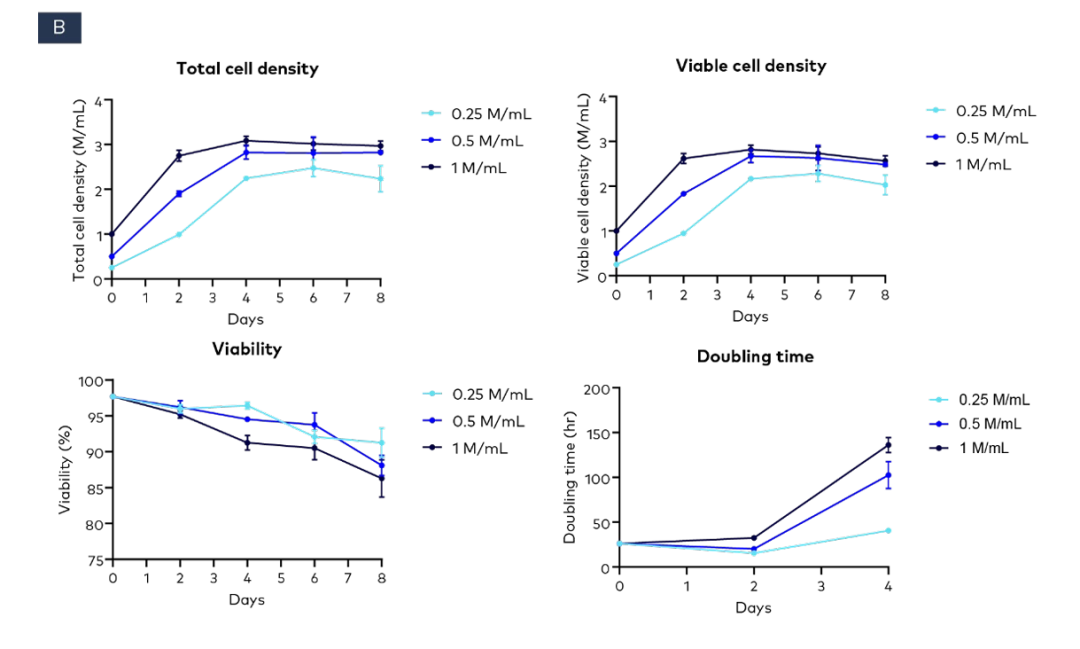 圖2 (A)細(xì)胞密度接種示意圖。不同細(xì)胞密度下DO和pH曲線數(shù)據(jù)。(B)每隔2天測(cè)定并分析細(xì)胞總密度、活細(xì)胞密度、活率和倍增時(shí)間。數(shù)據(jù)以平均值±SEM表示。