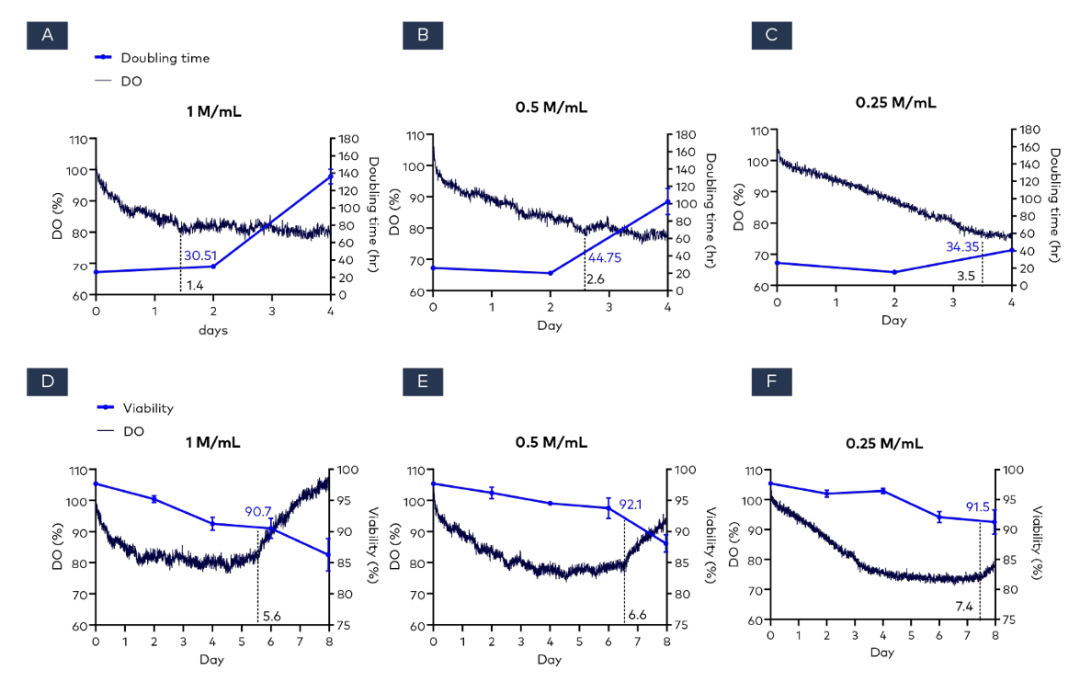 結(jié)果顯示DO值下降到80%左右,細(xì)胞倍增時(shí)間約為30小時(shí)(圖3A-C)。與細(xì)胞接種密度有關(guān),1 M/mL的細(xì)胞接種密度倍增時(shí)間最短,表明細(xì)胞生長最快。當(dāng)細(xì)胞活率下降到90%左右時(shí),DO值開始增加(圖3D-F)。起始細(xì)胞密度越大,轉(zhuǎn)折點(diǎn)出現(xiàn)的越早,表明細(xì)胞生長受到的阻力越大。