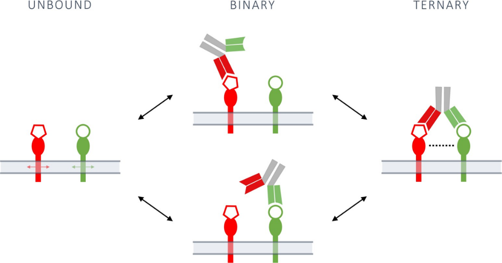 圖1. 雙特異性抗體與細(xì)胞表面兩個(gè)靶標(biāo)相互作用的二元和三元結(jié)合模式。