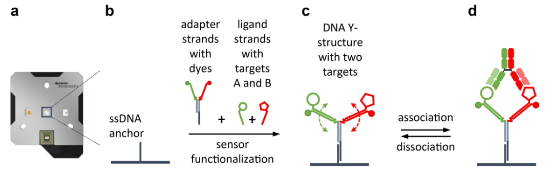 圖3. 芯片及Y結(jié)構(gòu)設(shè)計(jì)原理示意圖。(a) 帶有微流體通道的 heliX® 生物芯片,該通道具有兩個(gè)檢測(cè)spot;(b) 單鏈錨定寡脫氧核苷酸共價(jià)連接到芯片的金表面,以便進(jìn)一步與 DNA 功能化;DNA Y 結(jié)構(gòu)由兩條適配鏈組成,這些適配鏈用綠色和紅色染料修飾以進(jìn)行熒光檢測(cè)(實(shí)心圓),兩條配體鏈與相應(yīng)的靶標(biāo)(FIX = 空心圓,F(xiàn)X = 空心五邊形)結(jié)合;預(yù)成型的 Y 結(jié)構(gòu)通過(guò)將其堿基雜交到芯片表面的“錨”鏈上而固定 (c) 用 DNA Y 結(jié)構(gòu)功能化的芯片表面,具有兩個(gè)柔性臂,用于在不同距離處顯示抗原。;(d) Emicizumab 與 FIX 和 FX 靶標(biāo)結(jié)合。測(cè)量靠近各個(gè)靶標(biāo)的綠色和紅色染料的熒光變化,以分別分析抗體臂與 FIX 和 FX 的結(jié)合。