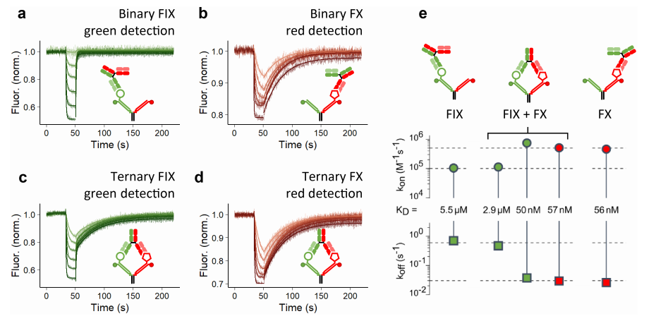 圖4. 實(shí)時(shí)測(cè)量 Emicizumab 與固定在 DNA Y 型結(jié)構(gòu)上的 FIX 和 FX 的結(jié)合和解離。bsAb emicizumab 的濃度為 0.0512、0.128、0.32、0.8、2、5 μM。(a) 二元 FIX – emicizumab 相互作用在僅用 FIX(無(wú) FX)修飾的 Y 型結(jié)構(gòu)上測(cè)量,信號(hào)檢測(cè)為綠色。(b) 二元 FX – Emicizumab 相互作用在僅用 FX(無(wú) FIX)修飾的 Y 型結(jié)構(gòu)上測(cè)量,信號(hào)檢測(cè)為紅色。(c) 和 (d) 三元相互作用在用 FIX 和 FX 修飾的 Y 型結(jié)構(gòu)上測(cè)量。信號(hào)同時(shí)以綠色 (C) 和紅色 (D) 測(cè)量。(e) 分析的結(jié)合(頂部)和解離(底部)速率常數(shù)的速率尺度圖,以及解離常數(shù) KD(中間)。二元相互作用 (a、b) 和三元 FX 相互作用 (D) 用單指數(shù)擬合函數(shù)分析,F(xiàn)IX 臂上的三元相互作用 (C) 用雙指數(shù)擬合函數(shù)分析。擬合線在測(cè)量數(shù)據(jù)上繪制為平滑線,采樣時(shí)間為 200ms。