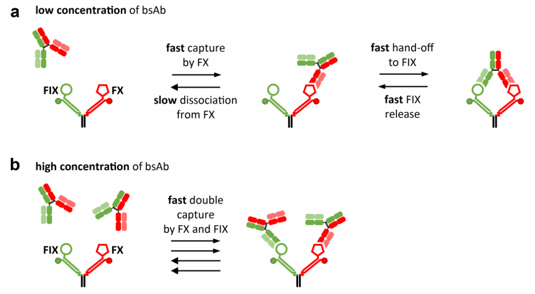 圖 5. 低 (a) 和高 (b) 濃度的 emicizumab 的主要結(jié)合模式示意圖。 (A) 在低濃度下,與 FX 的更快結(jié)合會(huì)捕獲抗體并允許快速移交給 FIX,從而形成三元復(fù)合物。(B) 在高濃度下,親和力較低的 FIX 也會(huì)快速結(jié)合抗體,從而在一個(gè) Y 型結(jié)構(gòu)上產(chǎn)生兩個(gè)二元相互作用。(A) 和 (B) 的組合可觀察為濃度依賴性雙指數(shù)解離曲線。