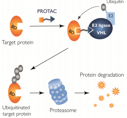 小分子誘導(dǎo)的靶蛋白選擇性降解是目前最有前途的新一代藥物發(fā)現(xiàn)方法之一。以 PROTACs(PROteolysis-TArgeting Chimeras)為例,雙功能小分子可以誘導(dǎo)靶蛋白連接到E3連接酶上,隨后形成靶蛋白/PROTAC/連接酶三元復(fù)合物,促進(jìn)細(xì)胞靶蛋白通過蛋白酶體降解(下圖)。