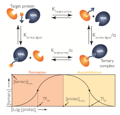 而下圖中所呈現(xiàn)的曲線則展示了基于PROTAC的系統(tǒng)的另一個特點,三元復(fù)合物平衡呈現(xiàn)鐘形劑量反應(yīng)曲線。在這個系統(tǒng)中,增加PROTAC的總濃度會導(dǎo)致三元復(fù)合物濃度降低(也稱為 "鉤子效應(yīng)"),大量過剩的PROTAC會使目標(biāo)蛋白和連接酶各自達(dá)到飽和。如果 PROTAC 濃度設(shè)置得過高,在某些情況下可能會導(dǎo)致檢測不到這些三元復(fù)合物。