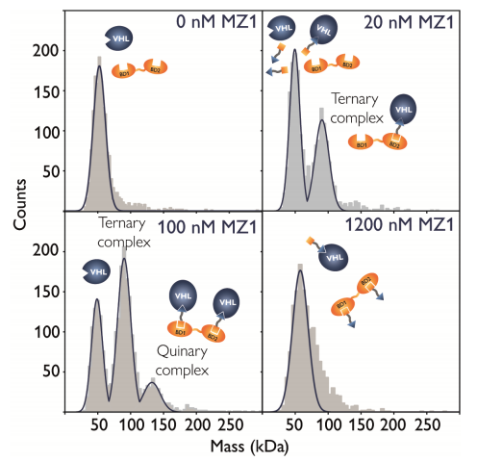 正如預(yù)期的那樣,在沒有PROTAC的情況下,檢測到一個約50 kDa的單峰,表明BRD4和VHL之間沒有蛋白-蛋白相互作用(VHL和BRD4之間的質(zhì)量差無法分辨)。在 20 nM MZ1 時,就出現(xiàn)了第二個群體,對應(yīng)于BRD4-MZ1-VHL復(fù)合物。50 kDa的峰值對應(yīng)于游離的VHL 和BRD4,以及與PROTAC分子的復(fù)合物,由于質(zhì)量差異較小,這些復(fù)合物無法分辨。將 MZ1 濃度提高到100 nM會進(jìn)一步增加BRD4-MZ1-VHL三元復(fù)合物的比例,并導(dǎo)致 BRD4-MZ1?-VHL?二元復(fù)合物的形成。由于VHL的濃度是BRD4的兩倍,因此 50 kDa 處的剩余峰值主要反映了游離連接酶的情況。當(dāng) PROTAC 濃度超過 1000 nM 時,觀察到形成的三元復(fù)合物數(shù)量突然下降,這是二元相互作用取代三元復(fù)合物形成的結(jié)果。