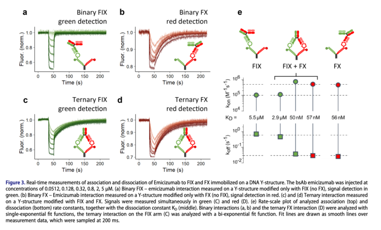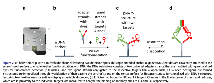 該 “Y” 型結構的兩個臂中,兩條適配鏈分別帶有紅色和綠色兩種熒光,兩條配體鏈分別攜帶有待檢測的兩種抗原。在Emicizumab的流體動力學研究中,分別是凝血因子FIX和FX。該設計突破了單個參數進行三元復合物檢測的局限,采用雙色熒光分別對每一個二元復合物進行檢測,同時,利用熒光分子與環境互作的敏感性光學原理,檢測三元復合物形成的狀態。