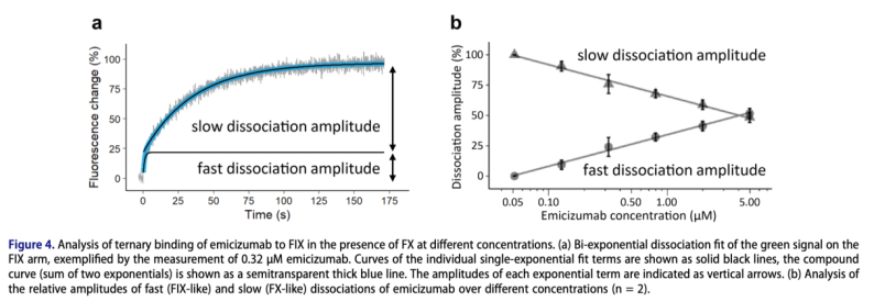 如Figure 4所示,隨著Emicizumab濃度的增加,慢解離過程所占的比例逐漸增加。這說明,濃度提高,FIX與抗體結合的動力學影響程度提高;而在低濃度時,FX與抗體結合的動力學影響程度提高。這對于指導后續臨床類藥物的開發具有極大的意義。而傳統的二元復合物檢測技術,無法實現該參數的測量與數據的擬合。