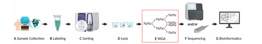 E:由于典型的原核細(xì)胞DNA含量低,因此需要進(jìn)行全基因組擴(kuò)增(WGA)來(lái)產(chǎn)生足夠的DNA用于文庫(kù)準(zhǔn)備。
