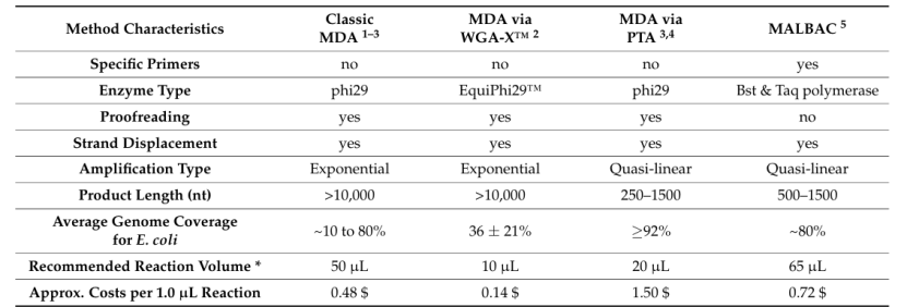一些微生物體內(nèi)只含有幾飛克DNA,所以其中WGA這一步操作至關(guān)重要,為接下來(lái)文庫(kù)的制備和測(cè)序奠定基礎(chǔ)。近幾年來(lái)不同的WGA方式也在不斷發(fā)展,但基于PCR的擴(kuò)增方法不適用于DNA含量極低的微生物,因此使用phi29高保真酶的MDA方法應(yīng)運(yùn)而生,但MDA整體反應(yīng)的耗費(fèi)極高,因此使用受限。在這里,我們列舉了幾種不同的WGA方法。見(jiàn)下表。