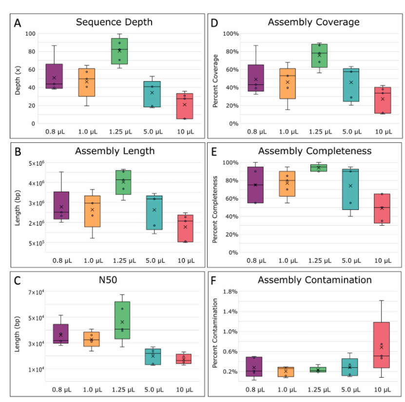 (F)組裝中的污染堿基百分比,方框中間的線表示中位數(shù),x表示平均值。五重復(fù)數(shù)據(jù)計(jì)算。