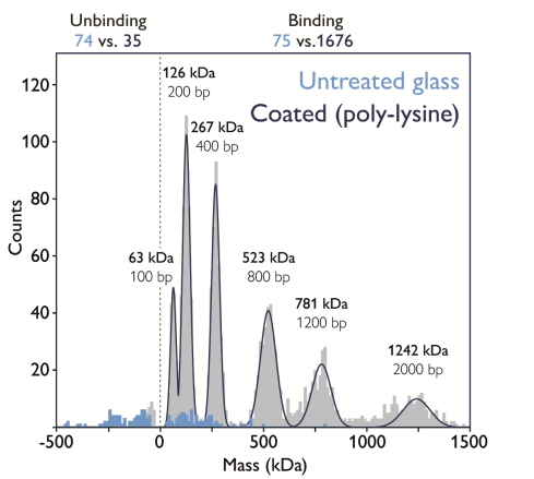 DNA和RNA在溶液中都帶負電荷,它們會被未經處理的蓋玻片排斥。因此,核酸檢測顯示出不頻繁的瞬時結合,這導致MP數據中的事件數量少且定義不清,觀察到的解除結合與結合一樣多(下圖藍色部分)。使用poly-lysine(PLL)簡單處理玻片即可避免這種情況的發生,使得檢測結果真實可信(下圖灰色部分)。