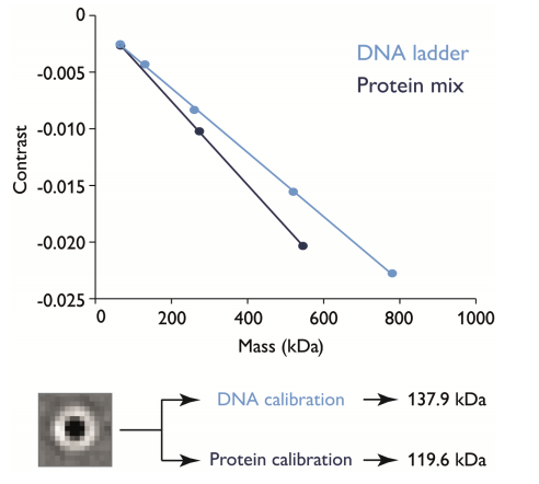 不同分子類型的光學特性(特別是折射率)會有所不同。因此,為了正確地將所測得的對比度與分子質量相關聯,應使用已知質量的、與被分析物分子類別相同的混合分子樣本進行校準。這些針對不同分子類別的校準結果均顯示出對比度與質量之間的普遍線性相關關系,但斜率不同(下圖)。與蛋白質的測量類似,市售的標準品(如凝膠電泳用)可用于校準DNA 測量。