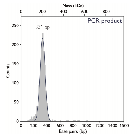 為了證明MP測量對核酸的實用性,我們使用了極少量的樣品(3 ng)來測定PCR產物的質量和均勻性。測量結果顯示,在218 kDa處有一個有效峰,相當于331 bp(下圖),與預期長度 335 bp 非常接近。