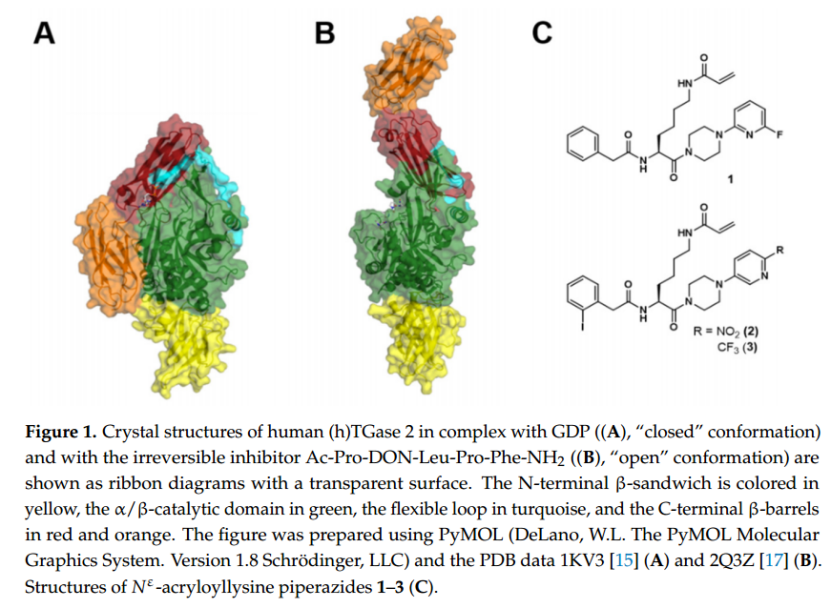 由于細胞內 GTP(≈100–150 μM)和 Ca2+(≈0.1 μM)濃度,TGase 2 在細胞內采用與“閉合”構象相關的構象,因此在生理條件下被認為基本上不具有轉酰胺酶活性 [31–33]。在與 Ca2+ 穩態喪失相關的生理應激情況下,會發生向“開放”構象的構象重塑;事實上,Ca2+ 水平會升高,蛋白質會變得具有轉酰胺酶活性 [31,32]。而轉酰胺酶TGase 2 主要在細胞外環境中發揮 TGase 活性,并被認為與纖維化 [34–37]和乳糜瀉 [38,39] 等病理生理過程有關。各種腫瘤實體的特征是 TGase 2 表達增加,這與不良預后有關 [40]。此外,TGase 2 似乎對癌癥干細胞的存活至關重要 [41–44]。這使得 TGase 2 成為治療診斷方法中一個有吸引力的腫瘤相關靶點,主要關注轉酰胺酶活性導向的共價抑制劑,其誘導 TGase 2 構象重塑為“開放”構象。通過這些藥物的作用,轉酰胺酶活性受到抑制,GTP 的結合受到阻斷 [45–47]。此外,有人認為這種構象重塑本身具有細胞毒性 [48,49]。因此,評估新化合物對 TGase 2 構象動力學的影響非常重要。