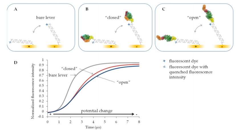 一種用于此類評估的新興技術是 switchSENSE®,如圖 2 所示。這種動態方法基于金電極上的電驅動 DNA 杠桿與高度時間分辨的熒光檢測相結合。除了多聚陰離子性質外,杠桿理想情況下還應具有盡可能大的機械剛度。因此,在大多數情況下,雙鏈 (ds) DNA [50–52],在某些情況下,特別是當需要驅動較重的蛋白質時,甚至更硬的 DNA 折紙結構也被用作杠桿 [53,54]。為了在表面上制備此類致動器,金電極用硫醇修飾的單鏈 (ss) DNA 寡核苷酸進行功能化。這些 ssDNA 鏈中的每一條都在其硫醇部分的對面末端帶有熒光團。在本研究中,第一步,通過表面結合寡核苷酸與互補 ssDNA 鏈雜交形成 48 個堿基對長的 dsDNA 桿(圖 2A)。然后,通過電觸發時間相關單光子計數 (E-TCSPC) 記錄所得的 16.3 nm 長的裸 dsDNA 桿的運動。當分別通過向電極施加正或負電位使桿被電極吸引或排斥時,這種動態模式能夠以 100 ns 的時間分辨率檢測熒光強度。熒光強度與熒光團與金表面的距離相關。由于能量轉移,隨著熒光團與金表面之間距離的減小,熒光不斷猝滅。 [55]