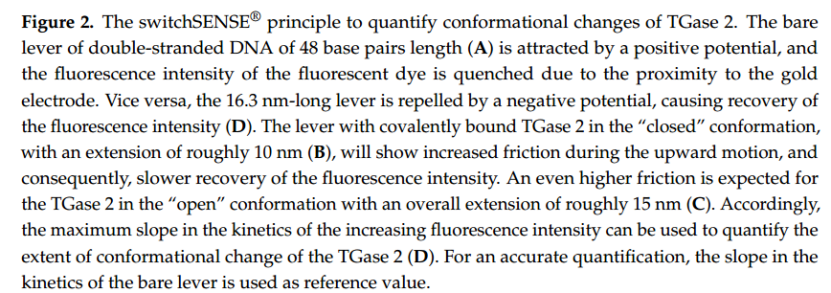 除了蛋白質的經典功能(例如充當生物催化劑或結合partner)之外,還需要考慮蛋白質的構象狀態及其在刺激下的重塑。經歷全面構象重塑的蛋白質的一個突出例子是轉谷氨酰胺酶 2 (TGase 2),其不同的構象狀態與特定功能密切相關。它參與各種病理生理過程,包括纖維化和癌癥,這推動了治療診斷劑的開發,特別是基于針對轉酰胺酶活性的抑制劑。在這種情況下,此類抑制劑控制 TGase 2 構象動力學的能力成為一個重要參數,所以亟需評估這種特性的方法。本文描述了 switchSENSE® 原理的應用,用于檢測由三種不可逆結合的 Nε -丙烯酰賴氨酸哌嗪引起的構象變化,這三種不可逆結合的 N" -丙烯酰賴氨酸哌嗪是 TGase 2 的合適放射性示蹤劑候選物。switchSENSE® 技術基于由交變電場驅動的 DNA 納米桿。這些杠桿的一端固定在金電極上,而杠桿的另一端則與 TGase 2 共價結合。通過一種新的計算方法來描述由此產生的杠桿運動,以量化刺激的構象 TGase 2 變化的程度。此外,作為一種補充的生物物理方法,在類似條件下進行了天然聚丙烯酰胺凝膠電泳以驗證結果。這兩種方法都證明了 三種研究的 Nε -丙烯酰賴氨酸哌嗪的結合引起了TGase 2 的構象平衡發生了不可逆轉變。