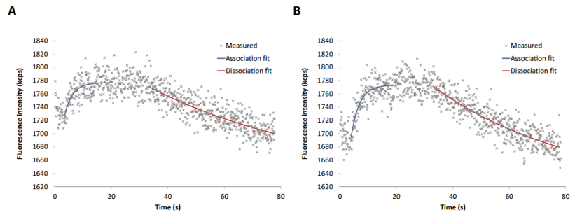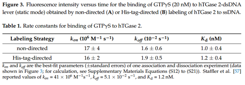 為了評估兩種標記類型的 GTPγS 結合動力學和 hTGase 2 伴隨的構象變化,首先應用靜態模式。為此,將 20 nM GTPγS 沖洗到電極上。在 GTPγS 存在下,熒光信號增加(結合,圖 3);通過去除核苷酸,熒光信號降低(解離,圖 3)。兩個 hTGase 2-dsDNA 杠桿的曲線模式相似。然而,與非定向標記(圖 3A)相比,His 標簽定向標記(圖 3B)提供了略高的熒光增加,同時伴有更高的信噪比。根據方程 (5) 和 (8) 進行回歸分析(參見材料和方法)給出了結合和解離的速率常數。解離常數 Kd 總結在表 1 中。兩種標記類型都產生了可比的動力學參數,Kd 值與 Staffler 等人在類似條件下獲得的值一致 [57]。