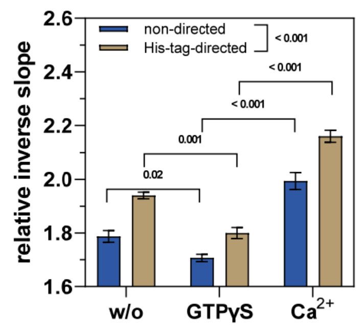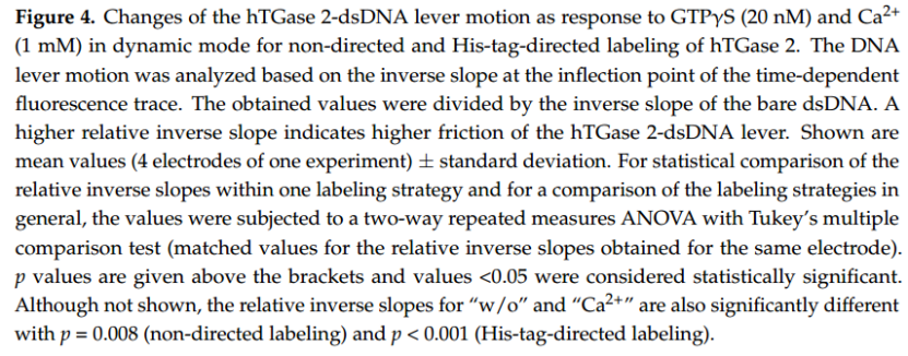 通過比較不同標記類型的結果,可以明顯看出 His 標簽引導標記產生的相對倒數斜率值明顯更高(p < 0.001)(圖 4)。這與在靜態模式下評估的 GTPγS 結合動力學的結果一致(圖 3)。因此,TGase 2 與 ssDNA 的位點選擇性偶聯(此處通過 His 標簽引導 DNA)對 switchSENSE® 兩種測量模式的數據質量都有積極影響,Staffler 等人最近也提出了這一建議 [57]。特別是對于 TGase 2,靠近 N 端的功能化是有利的,因為在用 GTP 類似物和 Ca2+ 刺激時,N 端 β 夾層較少參與構象重塑。但是,如上所述,His 標簽引導標記的主要缺點是制備結合物期間產量低。因此,我們決定利用非定向標記獲得的 hTGase 2-ssDNA 進行抑制劑 1-3 的構象影響實驗。