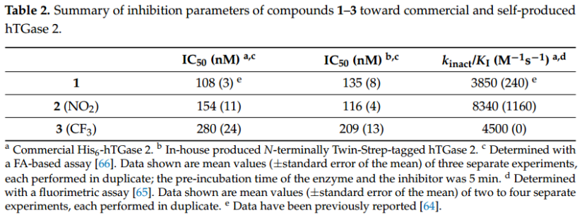 在分析抑制劑 1–3 對 TGase 2 構象動力學的影響之前,必須評估它們的抑制效力。雖然之前已顯示化合物 1 具有出色的抑制效力 [64],但化合物 2 和 3 代表新化合物。使用熒光測定法測定 2 和 3 的動力學抑制效力 [65],結果顯示 kinact/KI 值分別為 8340 M?1 s ?1 和 4500 M?1 s ?1 (表 2)。此外,在蛋白質和抑制劑預孵育 5 分鐘后,用熒光各向異性 (FA) 分析法測定了抑制轉酰胺酶活性的 IC50 值(2 和 3 分別為 154 和 280 nM,表 2)[64,66]。對于 SDS-PAGE 和天然 (GTP-)PAGE 實驗,我們使用了自制的 Twin-Strep 標記的 hTGase 2,該酶被化合物 1-3 抑制,其 IC50 值在市售的 His 標記的 hTGase 2 的范圍內(表 2,補充材料中的圖 S3)