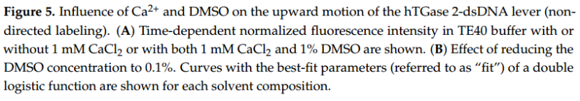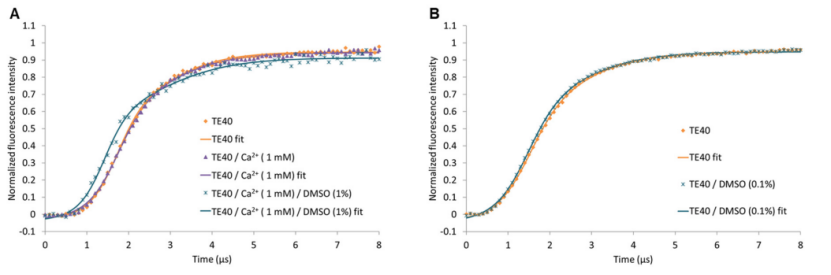 由于溶解度有限,抑制劑 1–3 的儲備溶液通常在 DMSO 中制備,因此用于生化和生物測定的最終 DMSO 濃度在 0.1% 至 5% 之間。為了確定 DMSO 的潛在干擾,我們使用不同的溶劑成分評估了裸露 DNA 桿的向上運動(圖 5)。雖然施加濃度為 1 mM 的 Ca2+ 不會改變時間依賴性熒光曲線的形狀,但與純水條件相比,1% DMSO 會導致曲線左移(圖 5A)。幸運的是,當 DMSO 濃度降低到 0.1% 時,曲線的形狀與水條件下的形狀基本相同(圖 5B)。因此,對于所有使用抑制劑 1–3 的 switchSENSE® 實驗,最終 DMSO 濃度均設置為 0.1%。目前無法給出觀察到 DMSO 影響的原因,但結果強調了仔細評估溶劑成分以避免測量偽影的必要性。