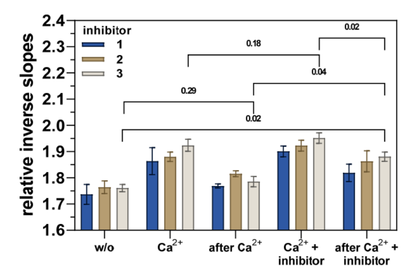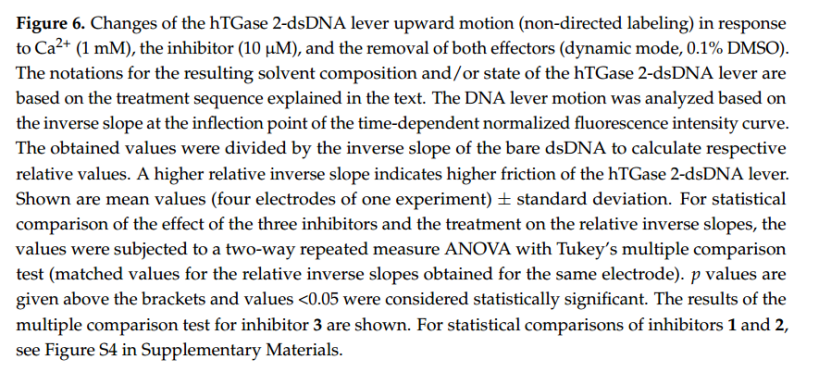 圖 6 顯示了相對倒數斜率對 hTGase 2-dsDNA 杠桿向上運動的影響。如前所述(圖 4),添加 Ca2+ 會增加摩擦力,因此,hTGase 2-dsDNA 杠桿的時間依賴性歸一化熒光強度曲線中的相對倒數斜率也會增加,在去除 Ca2+ 后,該曲線幾乎與添加 Ca2+ 之前相同(差異不具有統計學意義,圖 6 和 S4)。同時添加 Ca2+ 和抑制劑似乎會使摩擦力增加到比單獨添加 Ca2+ 更高的值(但這種差異對于所有抑制劑而言都不具有統計學意義,補充材料中的圖 6 和 S4)。對于抑制劑 3,隨后去除 Ca2+(“Ca2+ + 抑制劑之后”)會使摩擦力降低到與單獨添加 Ca2+(“Ca2+”)相似的水平,但與“w/o”和“Ca2+ 之后”相比仍顯著更高(圖 6)。對于抑制劑 1 和 2,這種趨勢相似;然而,應該注意的是,“Ca2++ 抑制劑后”與“w/o”和“Ca2+ 后”的差異中只有部分具有統計學意義(補充材料中的圖 S4)。因此,數據可能表明這三種抑制劑在不可逆結合后將 hTGase 2 的構象平衡轉變為更伸展的構象。Staffler 等人 [52] 最近使用 switchSENSE® 對肽類不可逆抑制劑 Z-DON-Val-Pro-Leu-OMe(“Z-DON”)獲得了類似的結果。面對不同條件之間相對逆斜率的輕微變化以及隨著治療周期的增加電極的某些老化效應,有必要使用互補方法來可視化由于配體的共價或非共價結合而導致的 hTGase 2 的構象變化。