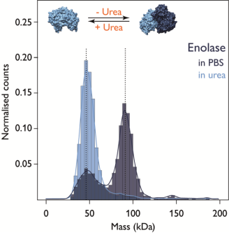 烯醇酶在原生和變性條件下的MP測量結果表明,MP對蛋白質的折疊狀態并不敏感。在原生條件下,烯醇酶主要形成90 kDa質量的同源二聚體和一些45 kDa質量的單體。在變性條件(尿素)下,二聚體分離成未折疊的單體,但同預期一樣,用MP測量的未折疊單體的質量(45 kDa)與折疊單體的質量相同(下圖)。MP對折疊狀態不敏感,因此是監測折疊依賴性低聚物的一種可行方法。