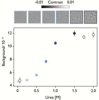 蛋白質解折疊實驗通常是在變性劑濃度非常高的情況下進行的。然而,尿素和GdnHCl 在水溶液中濃度較高時,會形成氫鍵團簇,因為團簇的光學性質與周圍溶液的光學性質不同,這種團簇可以用MP觀察到。這種差異會導致背景光散射,在MP圖像中顯現,隨著尿素濃度的增加,圖案及其相應的信號也隨之增加,直到尿素濃度超過1 M時達到一個峰值(下圖)。