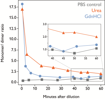 二聚體的恢復動態可通過繪制單體/二聚體比率與時間的函數關系圖來觀察。恢復速度取決于所使用的變性物質,可以看出,用GdnHCI變性的烯醇酶恢復得更快(下圖)。