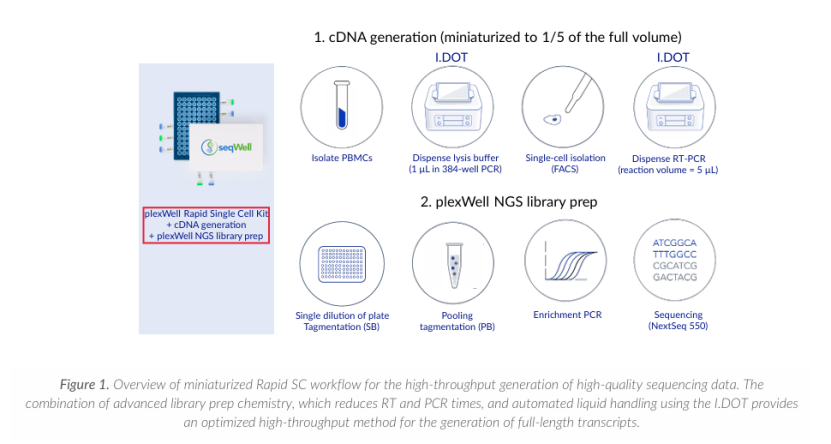 我們介紹了一種 plexWell 快速單細胞試劑盒(Rapid SC 試劑盒)工作流程(圖 1),其中 cDNA 生成被微型化并自動化,用于在一天內生產適合測序的全長轉錄組文庫。與 SMART-seq2 和其他傳統工作流程相比,這種微型化的 Rapid SC 工作流程的 cDNA 生成方法能節省試劑并縮短孵育時間,從而減少了文庫制備時間。Rapid SC 技術的獨特性,如自動歸一化,減少了需要進行質量控制(QC)測試的樣本數量,并且在下一代測序(NGS)文庫制備之前不需要標準歸一化。在 Rapid SC 工作流程的早期階段就對 cDNA 樣本進行了條形碼標記。NGS上機前使用 I.DOT 整合96個文庫也能使庫體積減少1/5??焖?SC 試劑盒與自動化 I.DO(384 孔板或更高規格)的結合提高了處理效率,并顯著降低了成本,同時還能生成高質量的測序數據。
