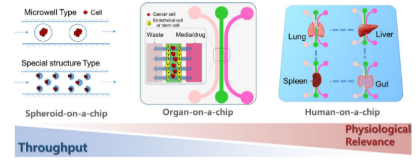 圖1. 體外模擬人體病理生理學的微流體灌注裝置??赏ㄟ^將細胞培養基連續供應到3D細胞聚集體中來建立芯片上的球體[20]。為了模擬“體內”類特征,芯片上器官可以通過共培養各種細胞(例如,癌細胞和內皮細胞)與ECM[14]。各種器官芯片的互連可以模擬人體循環系統(芯片上的人體),這可以增強生理相關性[21]的報告。芯片上的球體更有利于高通量藥物篩選,但生理相關性較低,而芯片上的人更具有生理相關性,可用于藥代動力學和藥效學,但固有的通量較低。