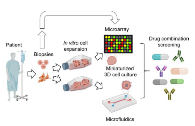 利用微陣列或微流體裝置進行患者來源的3D細胞培養(如球體或類器官培養),可以大規模開展藥物組合篩選,有助于為個體患者確定最佳藥物組合(圖2)。I.DOT技術在這一過程中,憑借其精確的液體分配和低交叉污染的優勢,能夠更好地處理珍貴的患者來源細胞。例如,在將患者來源的細胞接種到微陣列或微流體裝置時,I.DOT可以確保細胞均勻分布且不受污染,提高實驗的可靠性,為個性化醫療提供更準確的依據。