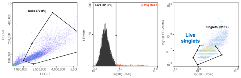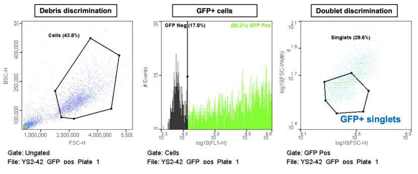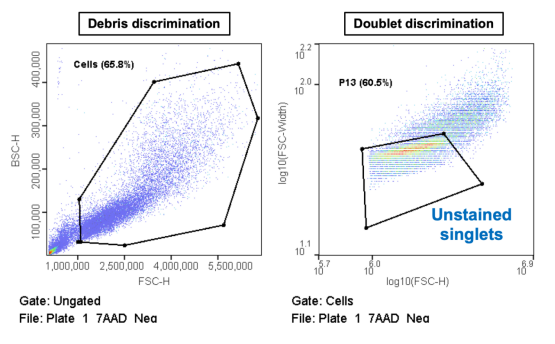 除了根據(jù)散射特性分析和分選無標記細胞外,WOLF G2細胞分選儀還可以根據(jù)熒光檢測(如GFP表達和熒光活力染色)進行分析和分選。熒光標記可以用于傳統(tǒng)的質粒轉染(下圖中上),也可以用于使用更高效的CRISPR-Cas9系統(tǒng)的轉染。此外,還可以用染料(如7-AAD)排除死細胞,這種染料標記細胞膜受損的細胞(下圖中下)。
