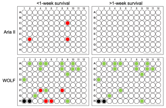 使用微流控WOLF G2細胞分選儀和傳統(tǒng)的BD FACSAria II分別將單個iPSCs細胞分選至96孔板,以評估置板率和細胞生長情況。Aria板中的細胞在分選后一周不再存活。相比之下,WOLF G2有14個單克隆長成(下圖)。