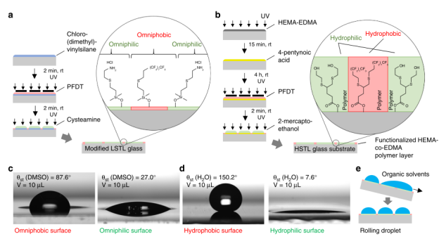 LSTL玻片:通過硅烷化處理和光化學(xué)硫醇-烯點(diǎn)擊反應(yīng),在玻璃表面形成親疏兩性圖案(圖1a)。親水性區(qū)域可穩(wěn)定低表面張力有機(jī)溶劑(如DMSO),疏水性邊界則通過全氟癸硫醇(PFDT)修飾,實(shí)現(xiàn)微滴陣列的精準(zhǔn)控制。