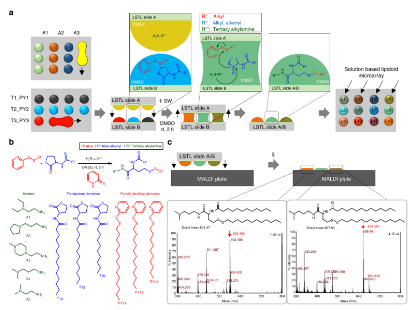 圖2. 一個(gè)脂質(zhì)體庫的片上合成和表征。a. 使用chemBIOS平臺(tái)組合合成脂質(zhì)體的示意圖。在第一步中,將溶解在DMSO中的各種胺逐柱施加到低表面張力液體(LSTL)載玻片A上。然后,將溶于DMSO的硫內(nèi)酯和吡啶基二硫化物衍生物的混合物以與載玻片A上的列正交的行施加到LSTL載玻片B上。通過滾動(dòng)溶液液滴以形成成排的單獨(dú)液滴來進(jìn)行施加。在下一步驟中,將載玻片A和載玻片B彼此夾在中間(SW)以使各個(gè)液滴接觸以合并液滴,從而引發(fā)反應(yīng)。在室溫下2小時(shí)后完成反應(yīng)。在單個(gè)載玻片上一式三份合成每個(gè)載玻片25種不同的脂質(zhì)體。b. 反應(yīng)方案和反應(yīng)的所有不同前體的列表。c. 為了表征所產(chǎn)生的化合物,將載玻片A夾在MALDI板上,然后加入基質(zhì)并干燥板。MALDI-TOF質(zhì)譜測(cè)量(插圖中所示的光譜實(shí)例,正模式)使得能夠快速且方便地表征合成化合物的整個(gè)庫。(i)靜置,然后加入含有0.1%v/v三氟乙酸的1:1乙腈:水的10 mg·mL?1 α-氰基-4-羥基肉桂酸溶液。源數(shù)據(jù)作為源數(shù)據(jù)文件提供。