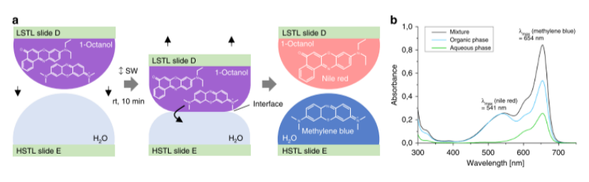 圖3. 片上平行液-液萃取。a芯片上兩相液體萃取過程的示意圖。親油尼羅紅和親水性亞甲基藍(lán)在1-辛醇的LSTL載玻片D上的混合物,通過將載玻片與HSTL載玻片E進(jìn)行10分鐘的水滴分離。兩種不混溶的溶劑之間形成界面,并將水溶性亞甲基藍(lán)提取到水相中。B通過紫外-可見光譜法驗(yàn)證芯片上提取。混合物的UV-Vis光譜顯示兩個(gè)局部吸收最大值:一個(gè)在541 nm處對(duì)應(yīng)于尼羅紅,另一個(gè)在654 nm處對(duì)應(yīng)于亞甲基藍(lán)。萃取后,有機(jī)相中亞甲基藍(lán)的最大吸收強(qiáng)度降低,而尼羅紅的最大吸收強(qiáng)度保持不變。在水相中,沒有檢測(cè)到尼羅紅。源數(shù)據(jù)作為源數(shù)據(jù)文件提供。