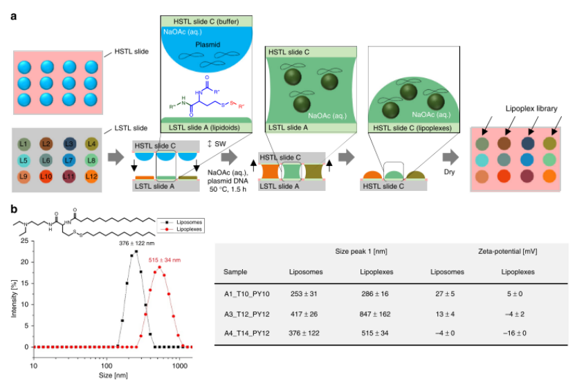 自動(dòng)化轉(zhuǎn)移:I.DOT將干燥的脂質(zhì)體轉(zhuǎn)移至HSTL玻片(圖4a),與含質(zhì)粒DNA(pCS2-GFP)的醋酸鈉緩沖液共孵育,形成脂質(zhì)復(fù)合物(lipoplexes)。動(dòng)態(tài)光散射顯示,lipoplexes粒徑(515±34 nm)顯著大于脂質(zhì)體(376±122 nm),zeta電位更低(-16mVvs+27mV,圖4b)