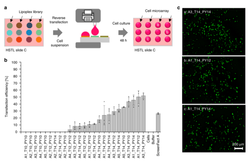 圖5. 所產(chǎn)生的lipoplex文庫的芯片上反向細(xì)胞轉(zhuǎn)染篩選。a顯示芯片上細(xì)胞轉(zhuǎn)染篩選過程的示意圖。將5微升的HEK 293 T細(xì)胞懸浮液印刷到HSTL載玻片C上的每個(gè)親水性斑點(diǎn)中,所述HSTL載玻片C被干燥的lipoplex細(xì)胞轉(zhuǎn)染混合物覆蓋。在36 °C和5%C02下孵育陣列48小時(shí)后,將1 μL染色溶液打印到每個(gè)液滴中,然后孵育15分鐘并進(jìn)行熒光顯微鏡分析。B可視化轉(zhuǎn)染效率(GFP轉(zhuǎn)染細(xì)胞數(shù)/總細(xì)胞數(shù))平均值的條形圖,其基于覆蓋整個(gè)管道的三個(gè)獨(dú)立實(shí)驗(yàn)(重疊的點(diǎn)圖)計(jì)算,包括芯片上文庫合成、脂質(zhì)復(fù)合物的形成和細(xì)胞轉(zhuǎn)染。在我們的研究中,A3_T14_PY14脂質(zhì)體被證明是最有效的,導(dǎo)致52 ± 4%的轉(zhuǎn)染效率。誤差條是標(biāo)準(zhǔn)偏差,n=3(重復(fù)次數(shù)); N=3(重復(fù)次數(shù),包括脂質(zhì)合成)。源數(shù)據(jù)以源數(shù)據(jù)文件的形式提供。c pCS 2-GFP轉(zhuǎn)染細(xì)胞的熒光顯微鏡圖像。比例尺:200 μm
