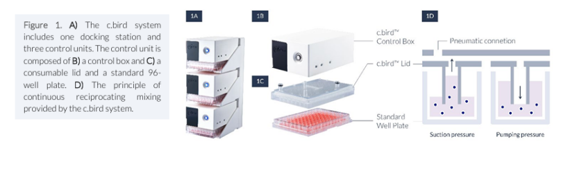 高通量技術正越來越多地應用于細胞培養實驗(CLD)流程中。這些技術能在小規模的培養皿/試管中提供懸浮培養環境,并增強氧氣供應。在本研究中,我們展示了一種新的系統,即 C.BIRD 微生物反應器系統,它能夠在標準的 96 孔板中實現早期階段的懸浮細胞培養。C.BIRD 系統結構緊湊,易于放入標準培養箱中。它有一個對接站,可容納三套 C.BIRD 系統(圖 1A)。該系統由兩部分組成:頂部的自主控制箱(圖 1B)和帶有 96 個圓柱形管的消耗性 C.BIRD 蓋子(圖 1C)。C.BIRD 蓋子上的管子提供了 96/24 個液流通道,使得在標準細胞培養板中的每個孔都能吸入和排出空氣。這些通道與氣動連接,并由控制系統驅動,從而在 96 孔板中每個孔內實現 150 - 200 μL 工作體積的連續往復混合(圖 1D)。有了 C.BIRD,就可以在 96 孔板中實現體積小至 150 - 200 μL 的細胞培養規模的三維懸浮培養環境。C.BIRD 可以模擬振蕩器的作用。在良好的細胞培養環境以及從早期階段就加速細胞系分化(CLD)進程的情況下,從而為細胞更好地生長以及克隆特征的可預測性提供了新的可能性。